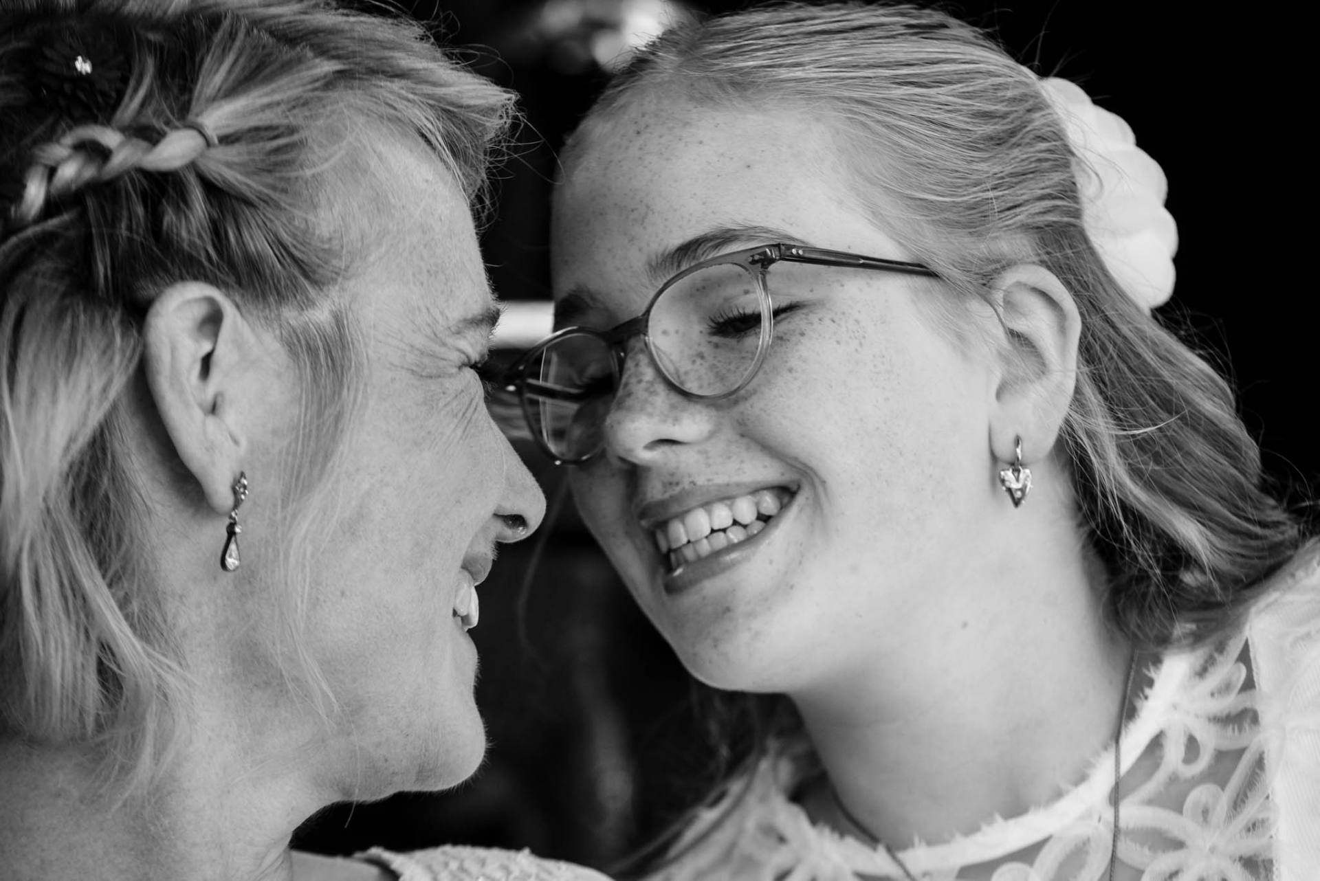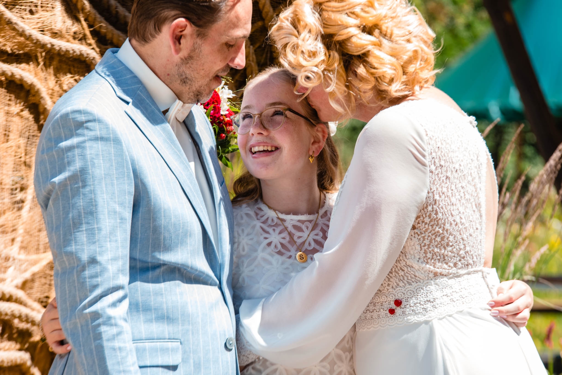 Een bijzonder detail: Senna helpt haar mama in de jurk. Met zoveel concentratie en trots maakt zij de jurk dicht. De zus van Carlijn helpt met het vastmaken van de sluier — wat nog best een uitdaging blijkt te zijn. Uiteindelijk staat iedereen te helpen, lachend en meedenkend. Precies zoals deze dag is: samen.