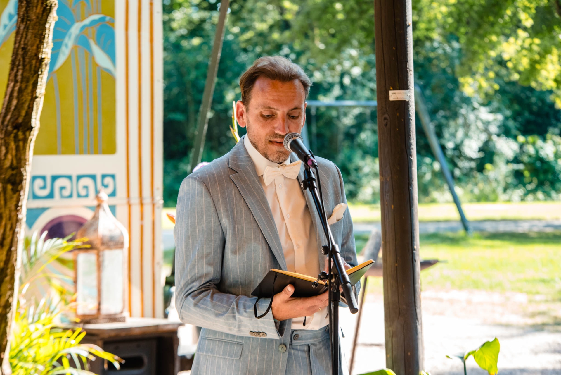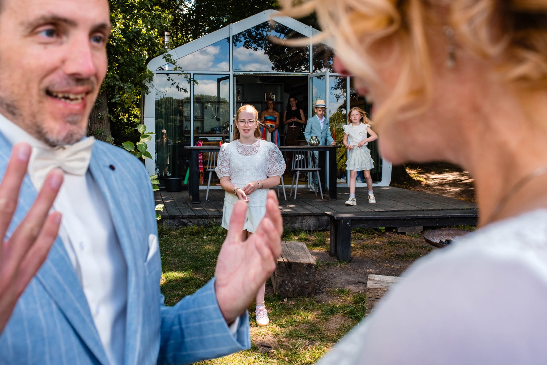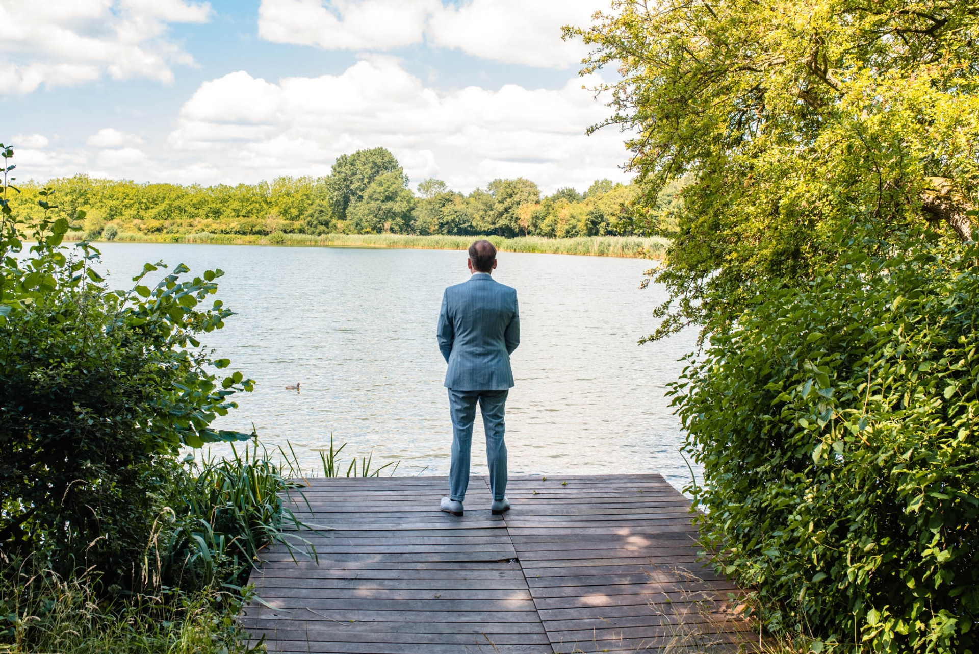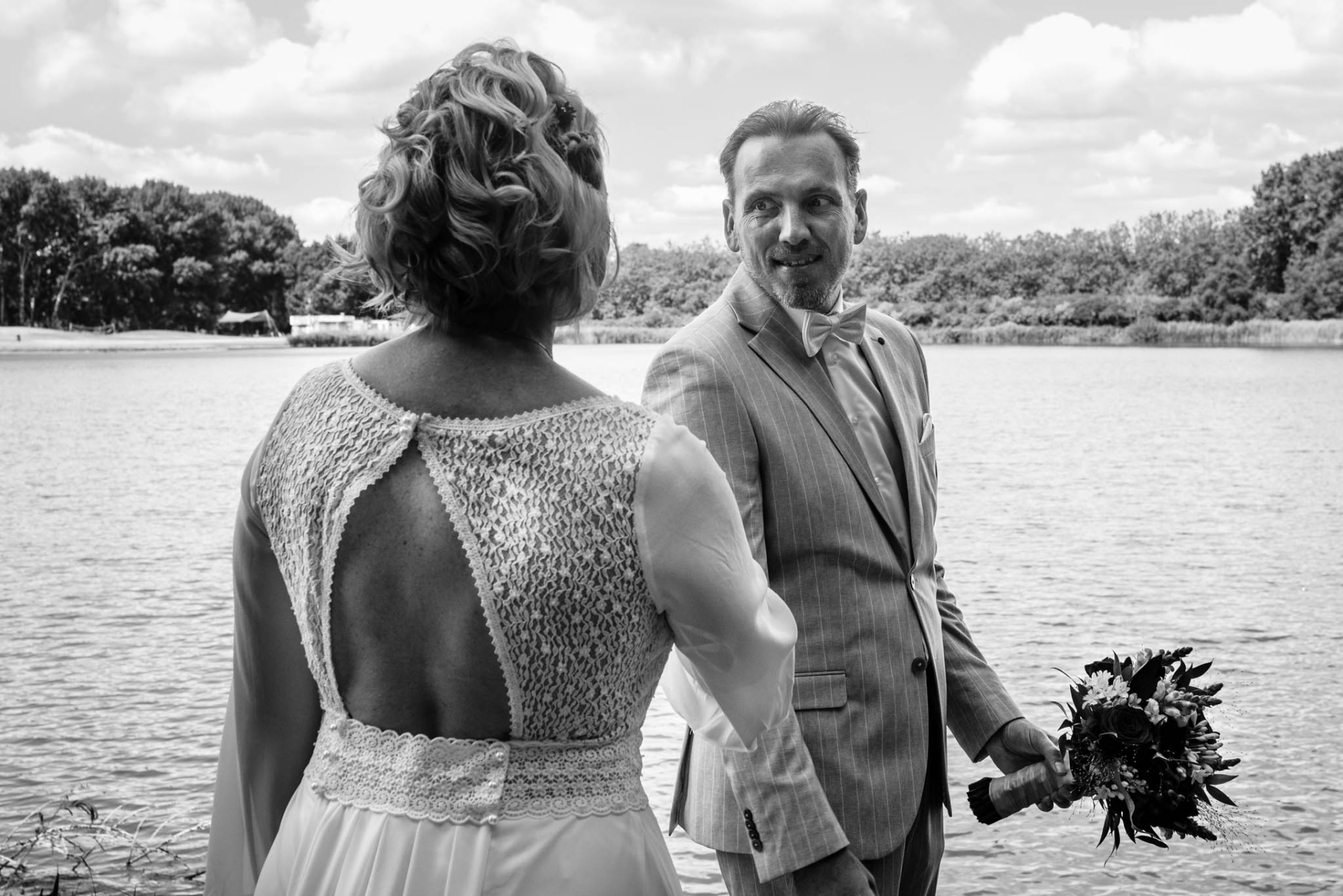 Buiten staat Peter al te wachten. Zichtbaar zenuwachtig, bloemen in zijn handen. Met uitzicht over het water van het Lingebos wacht hij tot hij zijn bruid mag zien.