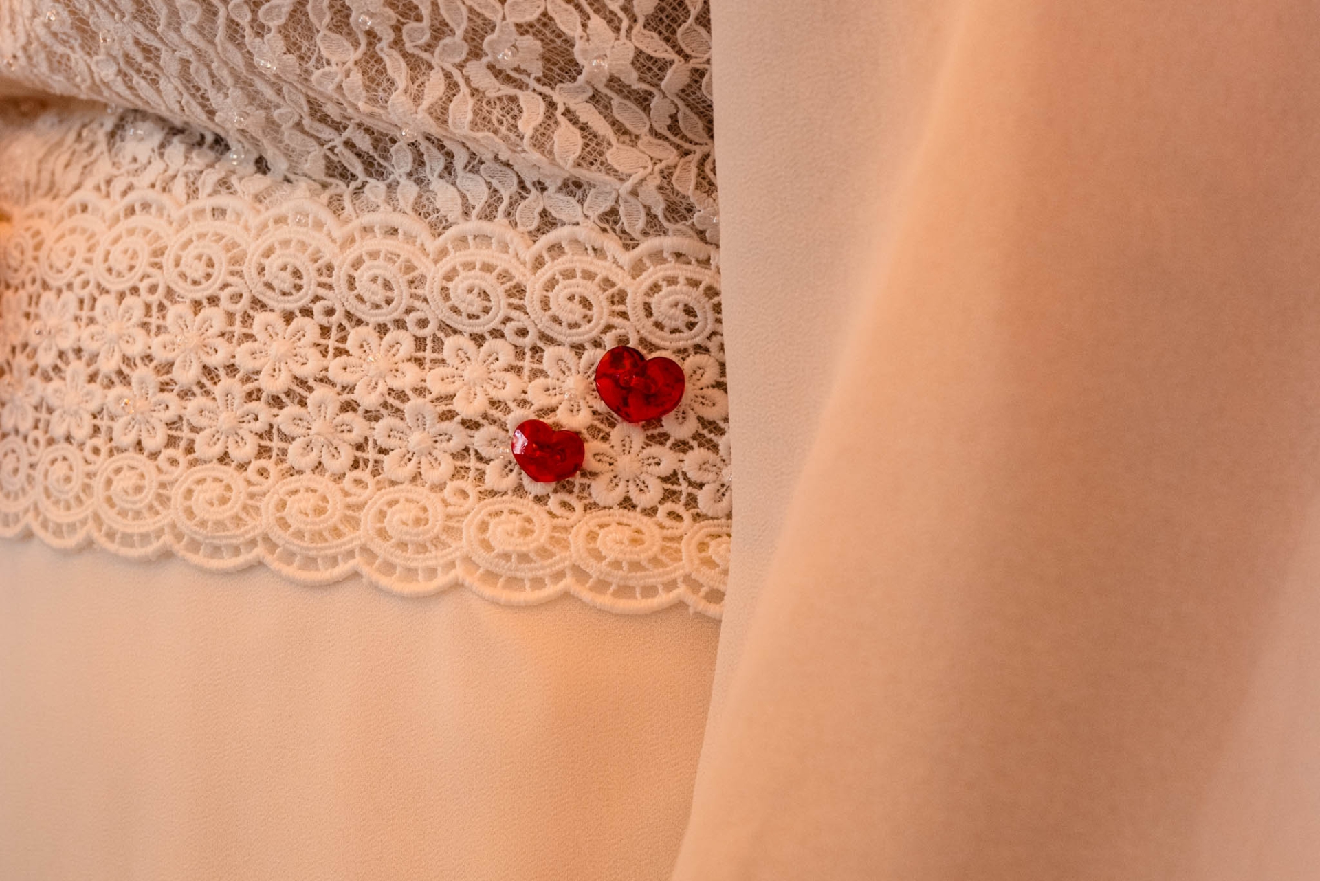Peter draagt een prachtig pak, met manchetknopen die verwijzen naar hun overleden tweeling. Ook Carlijn draagt die liefde bij zich: twee subtiele hartjes verwerkt in haar jurk. Kleine details met een grote betekenis.
