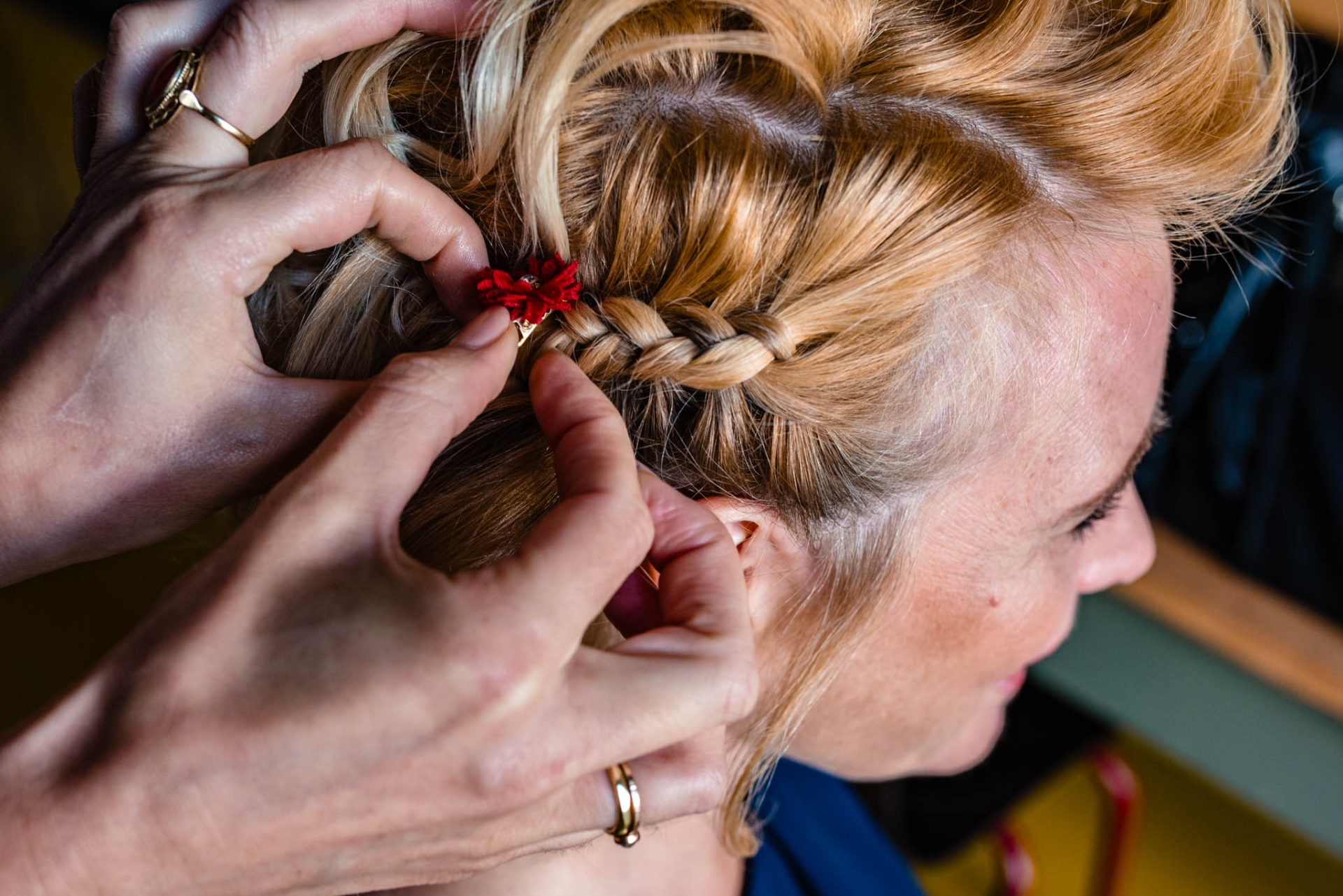 Wanneer ik binnenkom bij Carlijn, zijn de kapster en visagist al bezig. De sfeer is rustig, warm en intiem. Geen stress, geen haast. Gewoon samen zijn, lachen en genieten van het moment.