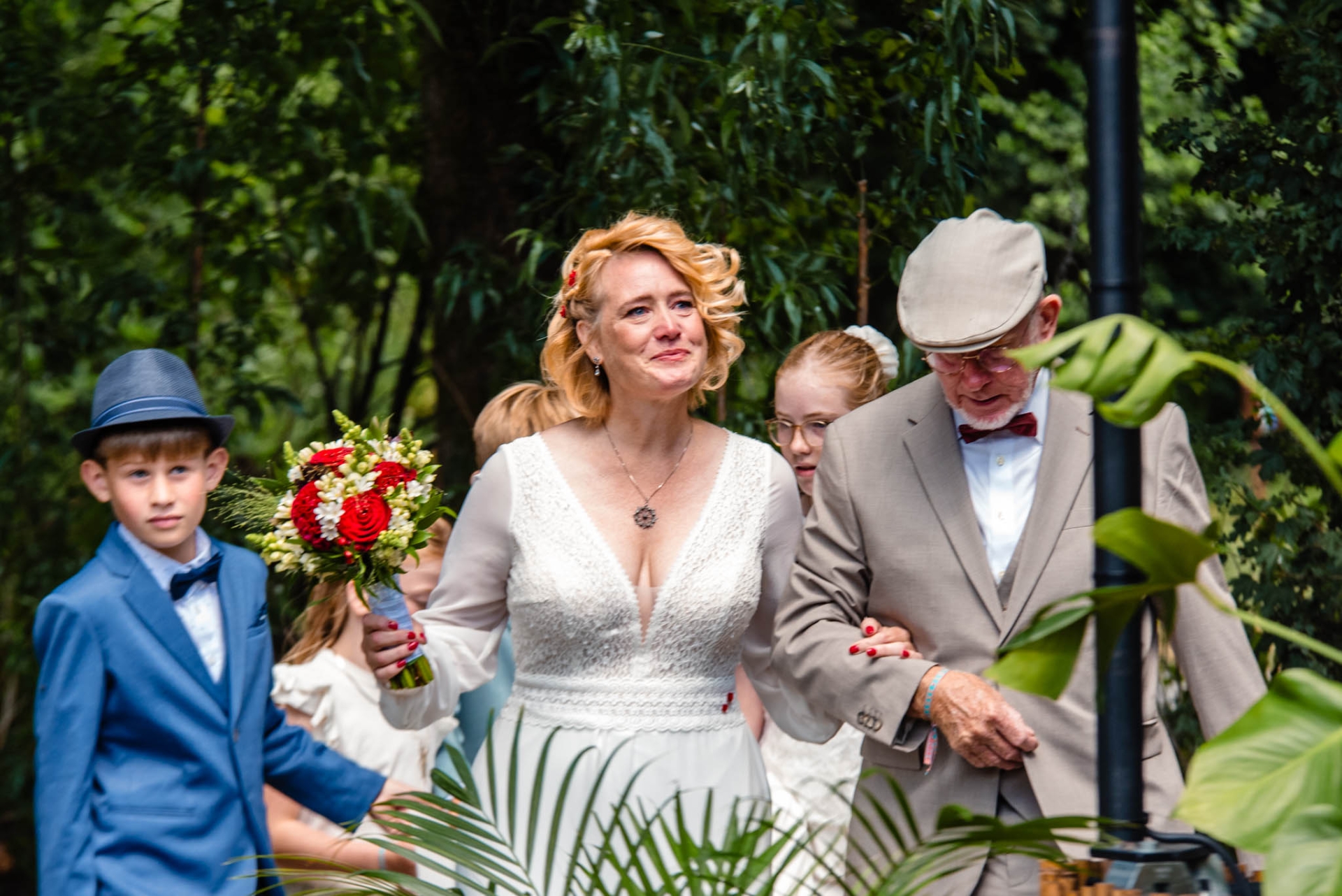 Ze wordt begeleid door haar vader, terwijl de kinderen haar sluier vasthouden.