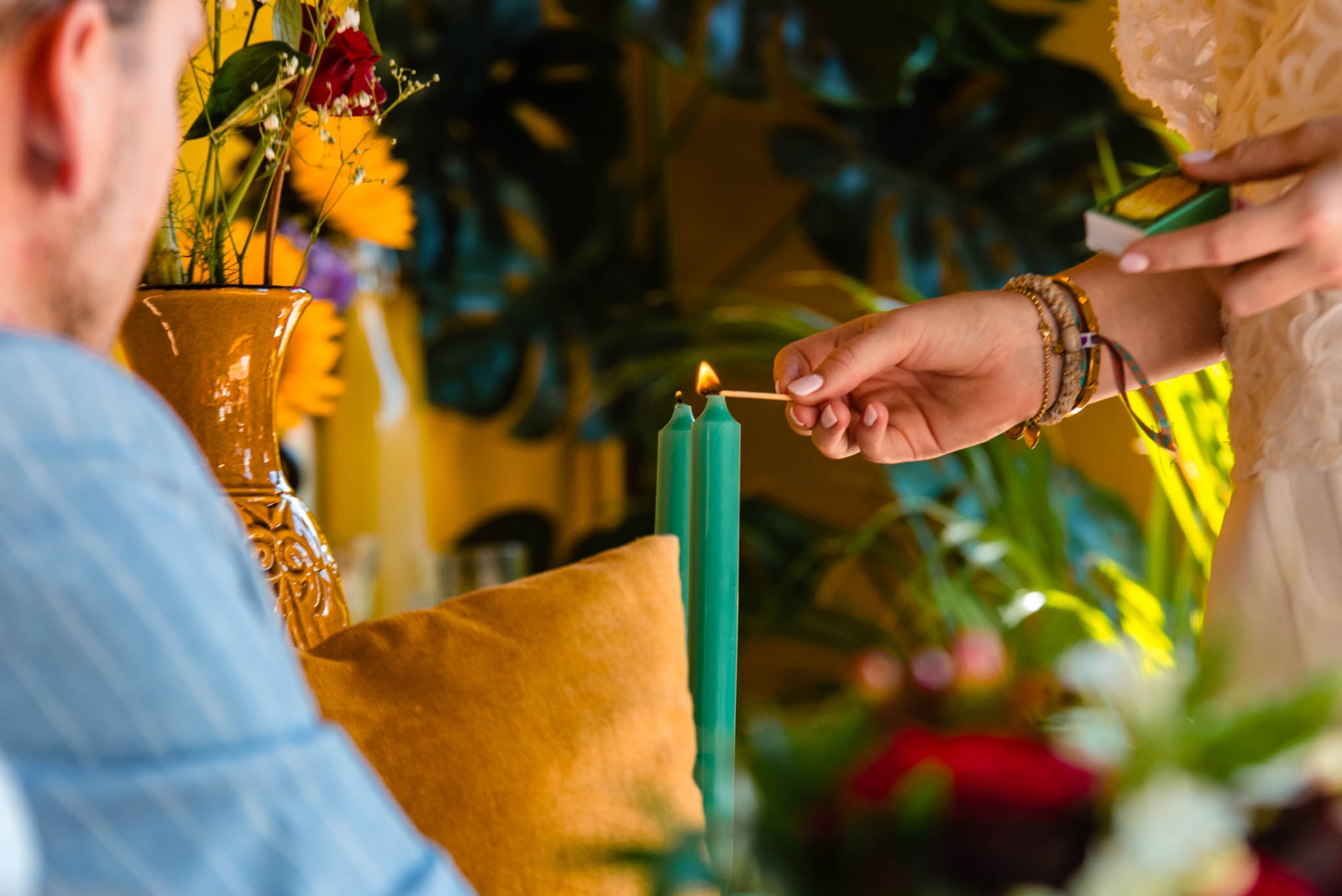 Een vriendin leidt de ceremonie. Er wordt een gedicht voorgelezen en Senna steekt kaarsen aan — een moment vol stilte en gevoel.