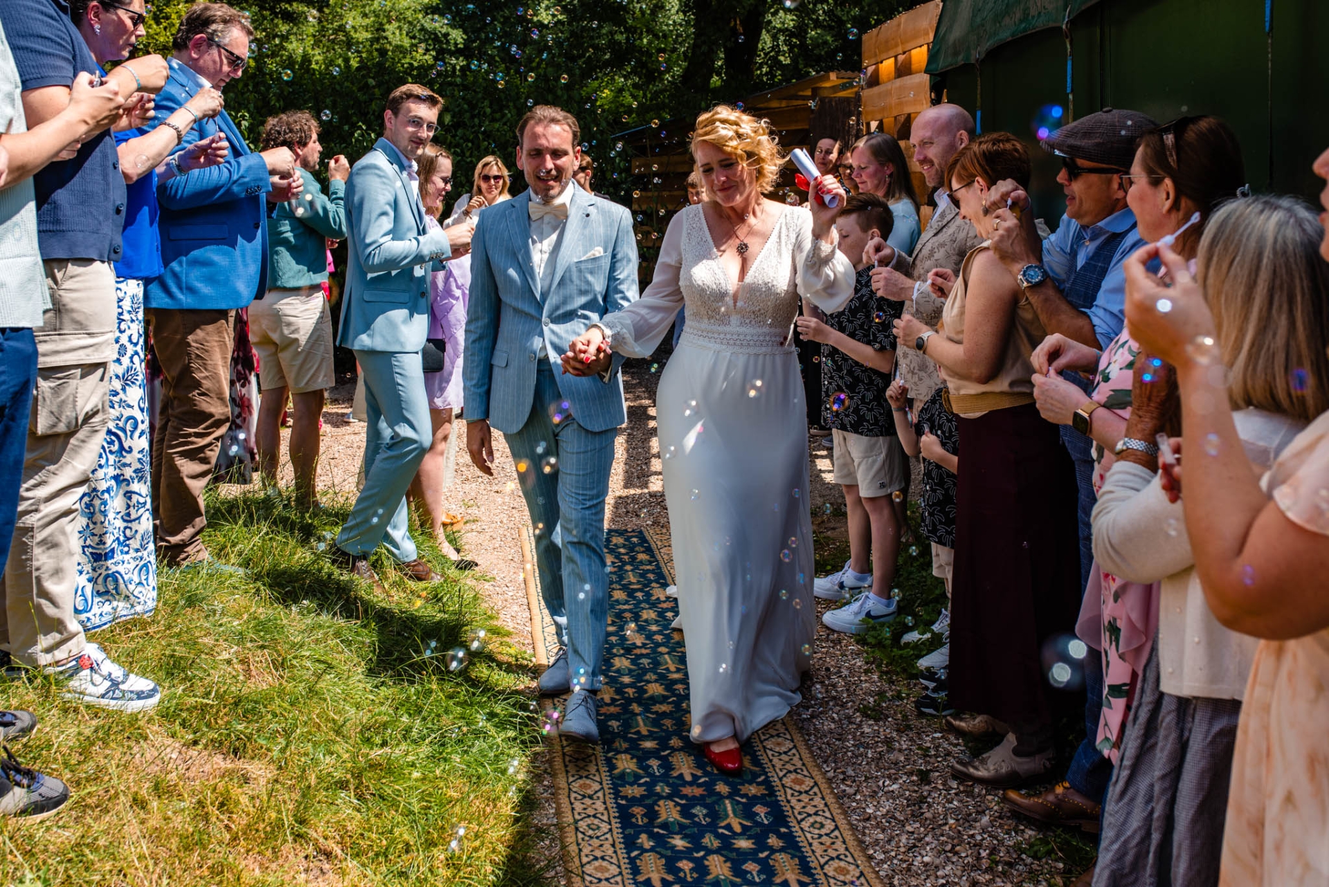 Na het tekenen van de akten wordt het bruidspaar uitgezwaaid met bellenblaas. Zoveel vrolijkheid, zoveel liefde.