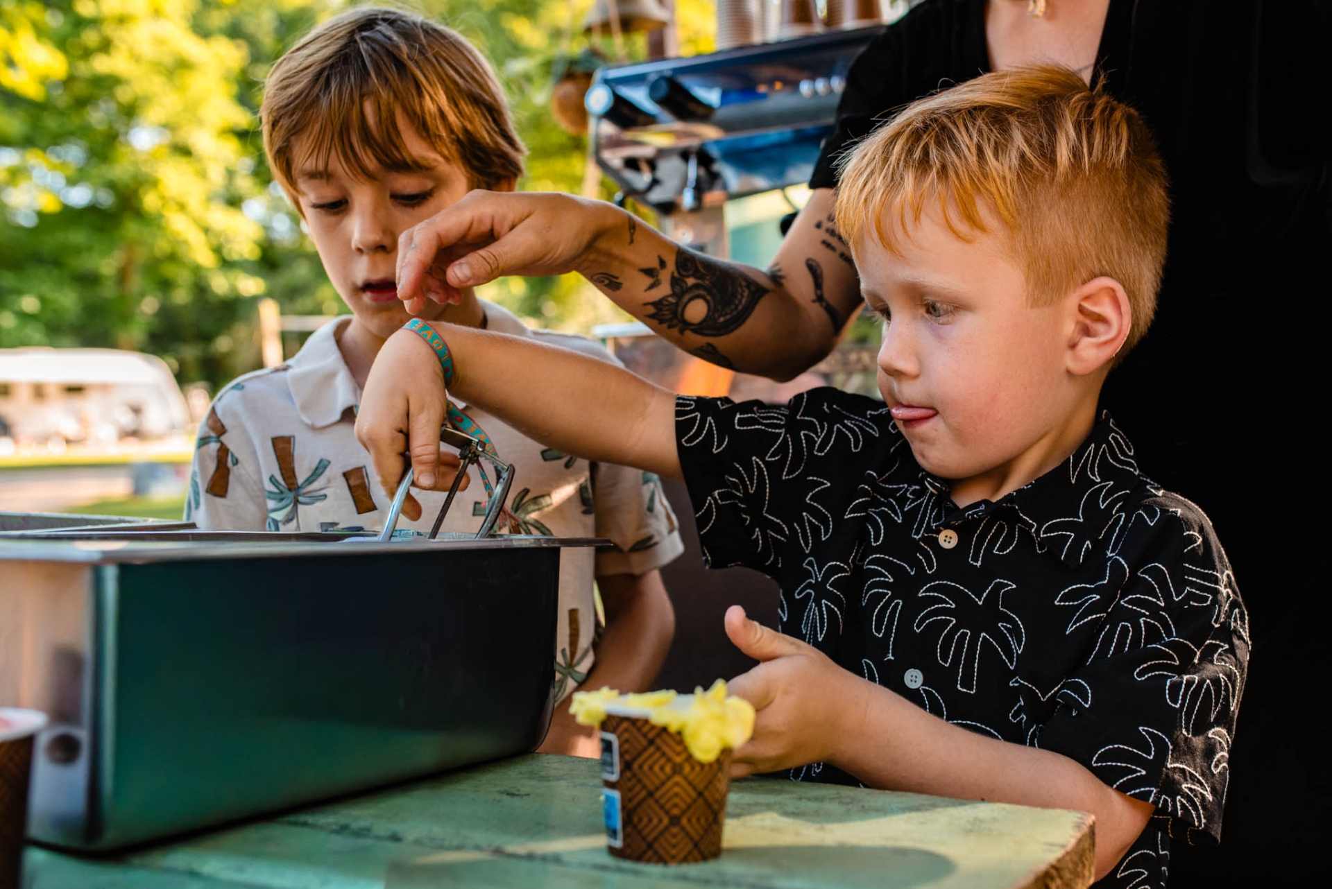 Het buffet wordt geopend. Kinderen mogen pizza’s pakken, van de barbecue komen heerlijke hamburgers en er is zelfs ijs om zelf te scheppen 🍦